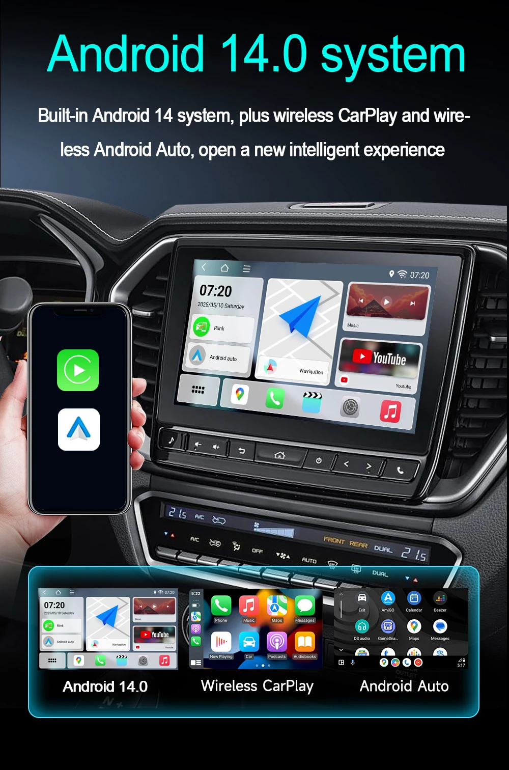 🌐 Belaidis CarPlay / Android Auto + Android TV AI Box (5-in-1) su Android 14, 4GB/64GB, 8-core CPU